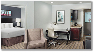 Appartment style hotel; only 4 miles from LAX; clean and spacious rooms; near Manhattan Beach; lobby area not very inviting; train outside can be noisy; good value for money