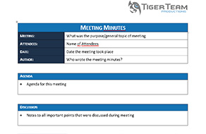 Meeting Minutes Template allowing you to record the important topics during a discussion and make the outcome and needed action points transparent to all participants.